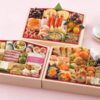 ヤリイカのエスカベッシュ/つぶ貝ときくらげの新丈/白きくらげときゅうりの和風マリネ/数の子美味漬/鯵の彩り金紙巻/フルーツチーズ/Xビーフのローストビーフ(ソース付)/うに二見焼/海老チリソース/サーモン重ね焼/梅花人参/ブリの子旨煮/帆立貝さんしょう煮/のどぐろかけぽん漬/うーじ糖とくるみのケーキ/にしん昆布巻/小海老の甘露煮