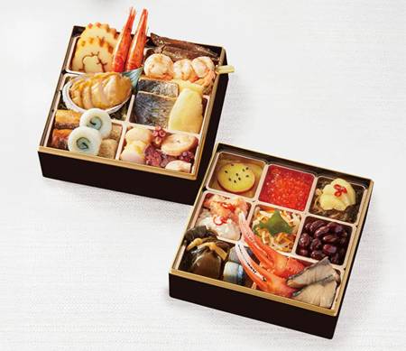 わかさぎ甘露煮/帆立貝ひもの佃煮/北海しまえび/伊達巻/ぼたんえびのゆず塩蒸し/北海道産味付け数の子/北海道産にしん甘露煮/煮あわび/昆布の煮付け/たこ柔らか煮/帆立のうにソース/たらこの山椒煮ゼリー寄せ/北海道産いかの梅しそ巻/鱈のうま煮
