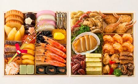 【和風】田作り/紅白かまぼこ/椎茸旨煮/紅白梅型羊羹/伊達巻/りんごきんとん(栗甘露煮)/黒豆煮/いくら醤油漬/数の子醤油漬け/ボイル海老/鶏松風焼き/あんず煮/銀鱈塩麹焼き/鮭昆布巻/よもぎ麩含め煮/なます
