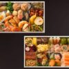 香りごまめ/手まりきんとん/菜の花福良漬/銀だら西京焼/市松かまぼこ/カシューナッツ旨炊き/にしん昆布巻/ブリの子旨煮/紅白梅麩/蛤うに焼/金箔黒豆/鯛金紙巻/数の子美味漬/竹の子土佐煮/海老塩茹で/4Xチキンのくわ焼/牛肉菜巻/五郎島金時のきんとん/栗渋皮煮/小松菜と菊花なめこ和え/銀鮭西京焼/白えび南蛮漬